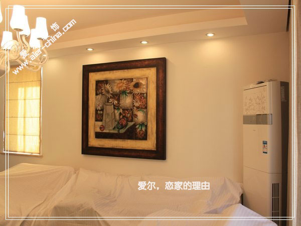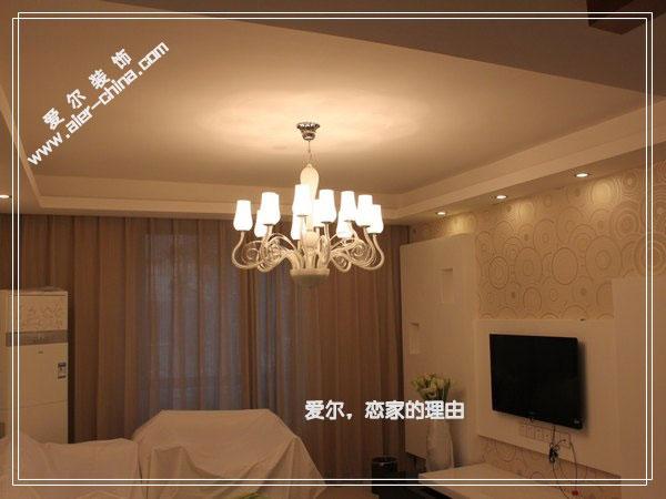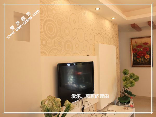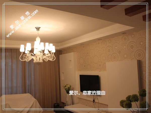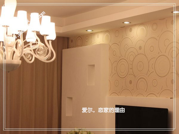 本案已经完工,这是刚拍的实景照片图。客厅电视背景是石膏板艺术造型+墙纸点缀。顶上方形吊顶,走灯带,另有筒灯点缀。沙发挂一巨幅艺术框画