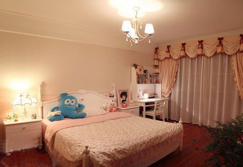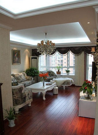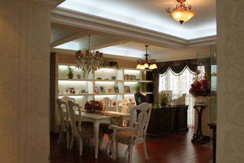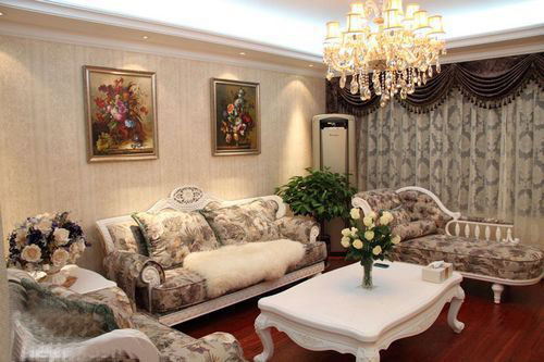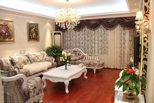 墙面上经典欧式风格的壁纸,配上略显厚重的挂画就构造出了欧式风格的轮廓。深浅相配的罗马窗帘使整个空间多了份稳重与大气,深色的木地板在硕大的水晶吊灯的照射下不再沉闷。植物盆景又给空间带来了活泼的氛围。