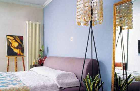 图中卧室中碎花被单铺在床上看起来简朴却不失单调,床左边的油画为屋子增添了一股浓浓的艺术气息。床的右边放着一面超大落地的镜子,镜子很干净可以清楚的看到镜子里照出的盆景,这样看起来房间的空间很大。
