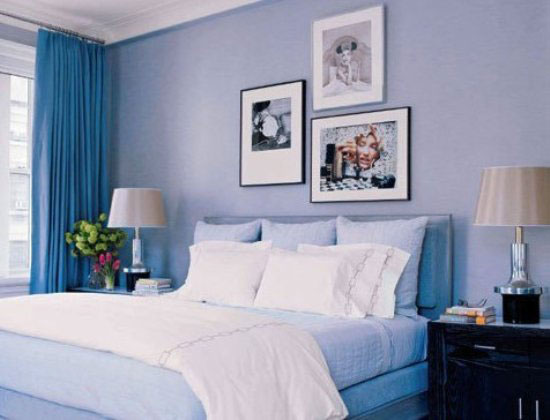 卧室中装修注重的是安静与舒服,图中卧室中蓝色的窗帘、被单和枕头是蓝色的,给人以安静的感觉很适合,墙上的之露出头像的相册很可爱,可以看出屋子的主人很懂得生活情趣。床头的花束的摆放,很好的装饰了卧室。