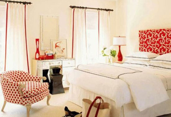 图中的卧室采光很好,白色落地的窗帘起到增加采光的作用。白底红点点的座椅看起来很时尚,成了房间一道靓丽的风景线。白的的被子和枕头看起来洁净而又舒服,软软的睡上去,一觉睡到自然醒将会是件多么美好的事情。