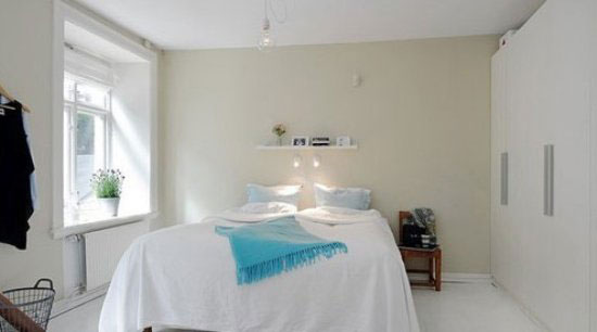 图中卧室的基调以纯白为主,床上的蓝色毛毯好似纯白中的一点蓝,让本是白的单调的屋子有了一点灵动的色彩,带一点活泼并且自然。窗台上的小盆景装饰着屋子,并带来一份自然的气息。