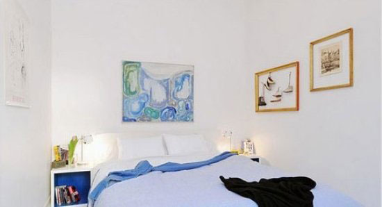 图中卧室的主色调是白色,蓝色的床品点缀着卧室白色的基调,流露出了淡雅,安静的气质来,给人以清爽、舒服的感觉来。墙上的手绘画,可以看出屋子的主人所含有的艺术气息。