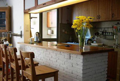 方方正正的椅子排放在餐桌前,方形会显得屋子里摆放的整整齐齐。餐桌那边,开放式的厨房干干净净的摆放在那边。木色的橱柜有个好处就是特别耐脏,木色的很有自然、怀旧、散发着浓郁泥土芬芳的色彩是美式乡村风格的典型特征。花束的摆放,为木色的餐厅增添了一抹亮丽的色彩。