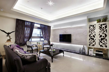 图中客厅中以白色做底色,紫色沙发和紫色窗帘做搭配,简约而不失时尚大气。电视机背景墙旁边的墙上镶上镂空的花纹,有股中国风的韵味在其中。白色的光束