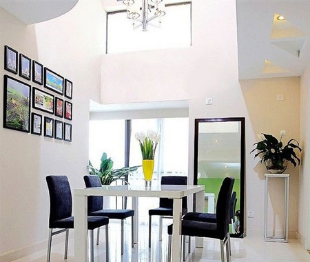 粉刷成黄色的墙面在白色的灯光下,屋子顿时充满温暖的气息。白色的餐桌搭配黑色的椅子,形成简约时尚的经典搭配。餐厅里放置的盆栽不少,及净化空气又美化了环境。墙上色彩缤纷的画册,给多彩的生活增添了一笔靓丽的颜色。