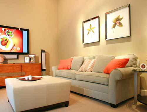 这是另一款客厅,室内的灯光洒落在米色的背景墙上,温馨而又优雅。植物图案的画册让客厅多了几份艺术韵味,这样的艺术氛围里,翻阅能一本书是没有问题的。简单而不失优雅是这个客厅的一大亮点。