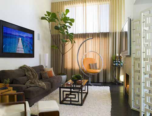 白色的墙壁搭配棕色的沙发,颜色比对让人们不禁感觉客厅散发着沉稳气息。镂空图案的茶几和旁边白色的屏风,顷刻间给客厅注入了中式元素。个性十足的椅子搭上橙色的坐垫,为客厅增添了一道风景线。