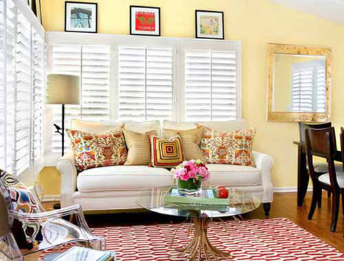 碎花的抱枕,红白相间的条色花纹,让整个客厅充满着田园气息。墙面粉刷是以黄色为背景,两扇窗户让客厅的光线变得格外好,让整个客厅显得宽敞而又温馨。茶几上的花束仿佛告诉坐在客厅的人们春天到了。