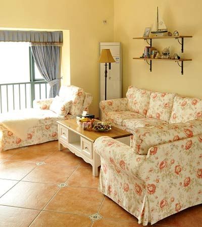 防滑的地瓷砖,碎花的沙发,看起来很搭都显示出浓浓的乡村风格。这样的瓷砖在主人打扫卫生时也很容易清除污垢,碎花的沙发清新自然,搭配黄色粉刷出来的墙壁,阳台的光线很好,很容易将阳光带进屋子里来,没事时也可以躺在沙发上晒太阳也是件不错的事情。墙上安置的两个板可以放不少东西,为房间房间收拾杂物省心不少。
