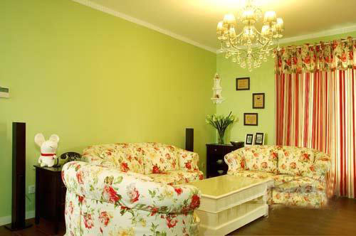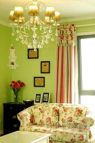 欧式田园以纯净的象牙白为色调,附以幽雅的碎花纹样墙纸,宁静中的美丽透着天然的高贵与典雅。欧式田 园风格,源于欧洲融合了欧式文化特有的时尚,兼具西方新古典风格和东方的后现代的神韵。 图中的客厅很清新自然,青色粉刷成的墙壁,有种青苹果的味道,对长期面对青涩的墙壁,视力也不会有影响的,典型田园风格的碎花沙发,如大家闺秀一般仪态大方,温柔典雅。象牙白的茶几,水晶的吊灯,水晶吊坠在灯光的照射下晶莹剔透,如星星一般星光闪闪。沙发后面的超大落地窗帘黄白相间的条文颜色是客厅里的一道亮丽的风景线,既遮住紫外线的射入有保护了主人的眼睛。放在柜头上的绿色花束可以说是客厅一大亮点,为客厅增色不少。青色的墙上挂上的几个画像,为这家客厅平添了一抹浓浓的温馨意味。