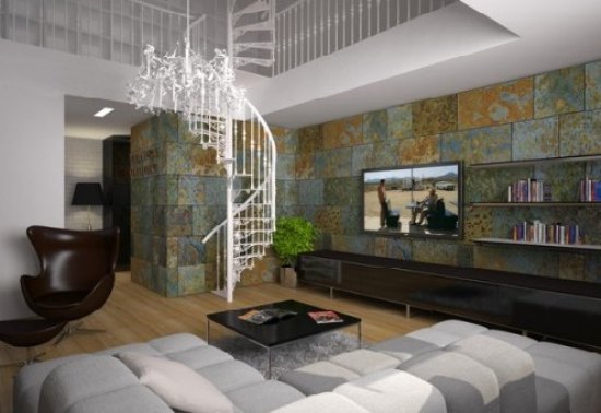 图中的电视机背景墙是用瓷砖贴上去的,瓷砖贴的很漂亮,像海底的珊瑚一般在海底摇曳。白色的螺旋状的楼梯让客厅这一深沉的颜色增添了一抹灵动的色彩。咖啡色的座椅,黑色的茶几还有灰色的沙发高雅且很耐脏,电视机旁放着一盆景,让客厅深沉的色彩平添一股生命的气息。电视机的另一侧是书架,不规则的书架上整齐的摆放着几组书本,看起来整齐又有个性。