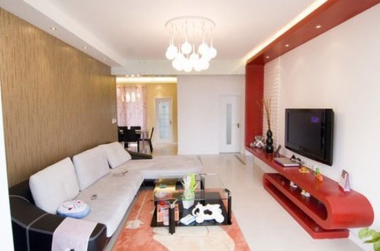 图中是简约式客厅,客厅红色体现在电视机背景墙上,既装饰了电视机背景墙又为储藏生活中杂东杂西的杂物提供储藏空间。玻璃似的茶几简单而又耐用,黑白搭配的沙发,清爽而又经典。白色的水晶吊灯照的客厅很明亮,让人身在客厅里的人们有视觉震撼。