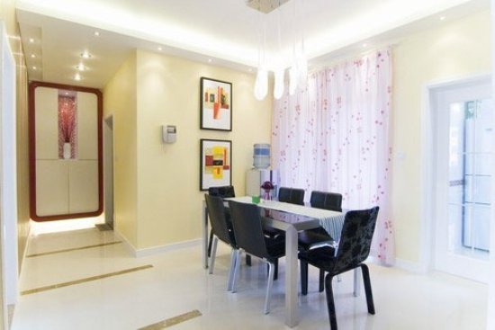 选用黑色的桌椅或许看起来有些冰冷,淡紫色的窗帘或许让这一冰冷的颜色有了少许柔和的娇媚和浪漫。餐厅墙上的这幅画给屋里添上一道靓丽的风景线,让餐厅颜色更加丰富。 客厅里虽然摆放简单却是应有尽有。