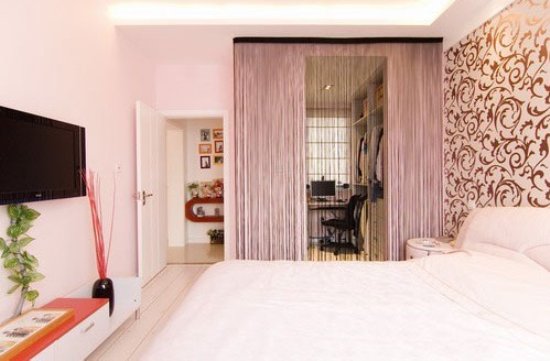 卧室里,白色的床让人不禁感叹纯白之美和清爽之感,黑色的电视机时尚大气,坐在床上看电视应该也是件不错的选择。床头的一侧布满镂空的花纹让简单布置的卧室增添一些品味。淡紫色的橱柜清楚的把床右侧的电脑和座椅照出来,让人感觉卧室的空间并不是很小,淡紫色的橱柜不禁让人们感觉到甜美之感。 |