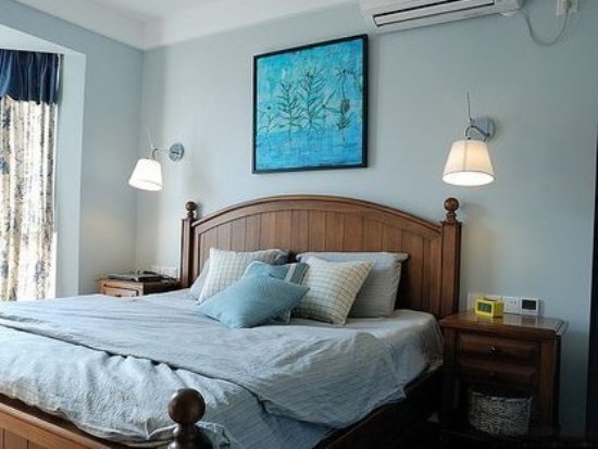 图中卧室的装饰含有地中海风格在其中,蓝色的床品和壁画,犹如大海的波浪席卷而来,一波接一波地拍击在沙滩上,然后慢慢退去。古木制的床我很喜欢,有一股乡村风格的气息融合在其中,睡梦中像是被带进大自然里一样。 |