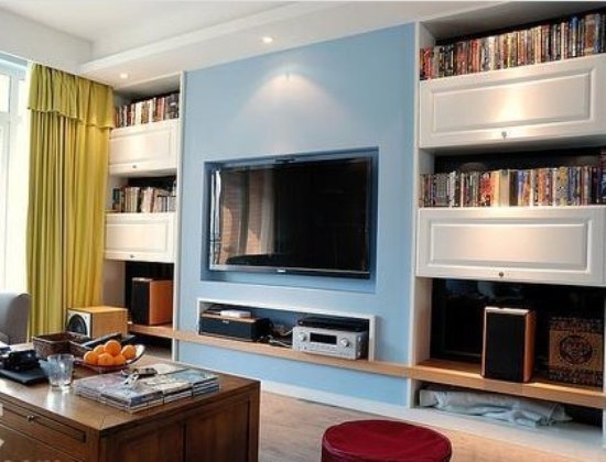 客厅这一面家居设计的很有创意,中间放置电视机,对称的两侧分为三层前两层放着书籍,底下一层储存杂物,节省了很多空间。