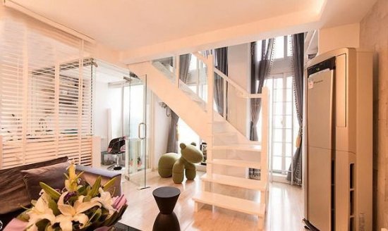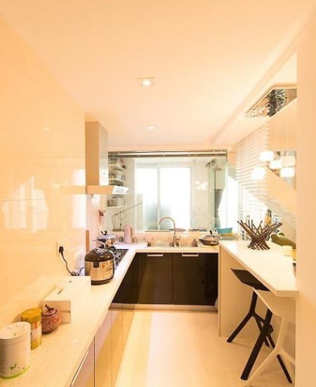 工作台连着厨房,节省了房子的不少空间。图中的厨房是开放式的厨房,房子的主人好像不经常在厨房做饭,可能经常吃盒饭吧,厨房看起来很干净整齐,让工作的人不会失去好好工作的心情。工作台不大,黑白两张椅子放在工作台下面,让工作台节省了空间,又整齐看起来又舒服。