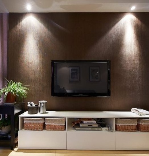 这是客厅的一角,这里放着电视机和电视柜,柜子里可以储存很多东西节省了不少空间。旁边的柜头放着一个盆栽,既起到装饰的作用又有防辐射的作用。电视机的背景墙是咖啡色的看起来有点暗,打开电视机左右两站射灯立刻明亮了起来,射灯的安装对眼睛也有好处。
