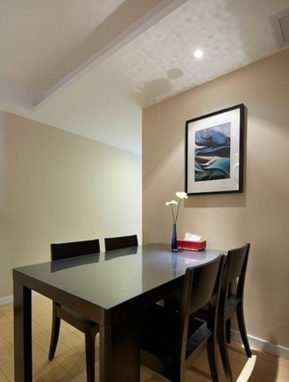 图中的餐厅很干净清爽,黑色的桌椅很拉风。餐厅的一头挂着一幅艺术画,让整个餐厅被一股浓浓的艺术氛围紧紧包围着。