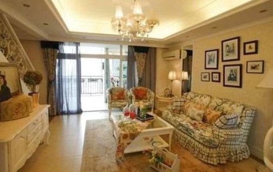 图中的客厅洋溢着田园风格的气息在其中,青格子的沙发洋溢着青春的气息,碎花的椅子完全是田园风格暗含其中。水晶吊灯和四面的射灯让整个客厅打扮的光彩照人,四面的画册更是将客厅推到艺术气息的氛围里面。