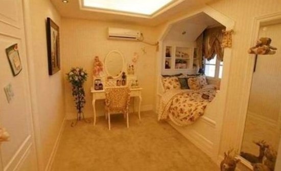 卧室中,梳妆台很有西式古典风格,很适合女子梳妆打扮。从整体看卧室不大,但足以住下一个人,这张床很奇特,仿佛是在墙上挖了个床,而且门还是六边形的。床头还安置着一个储物柜,为房间生活品德放置提供了空间让房间整齐并且有空间。 |