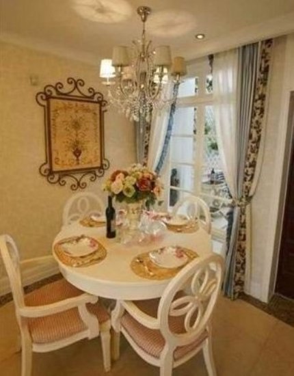 四张象牙白的椅子和一张摆放四个碟子的圆形桌子上,共主人吃大餐。仿真花的放置,让餐厅好像移置花园中用餐,想必有这样的环境用餐者的心情也很舒畅。墙上的画册也很有古典范儿!拉开超大落地窗帘,光线十分充足,餐厅的显得很明亮,很适合家吃饭聊天。