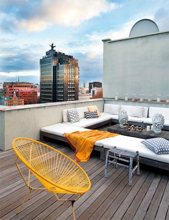 设计重点:露天客厅 推荐理由:如果是别墅的天台,那实在应该好好设计一番,朋友之间的周末聚会就可以安排在这里,邀三五好友来一场自助烧烤。居高临下享受城市风光。 轻便、简易的户外家具最实用,呼应老式家具最常用木地板,可铺上防水木地板,小孩子可以自由跑跳,即使是下雨天也不会有积水。 |
